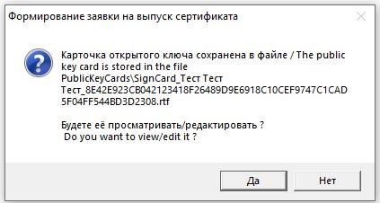 4) Просмотрите карточку открытого ключа, нажав на кнопку «Да». Проверьте корректность данных, внесенных в ЭЦП. Закройте карточку открытого ключа.